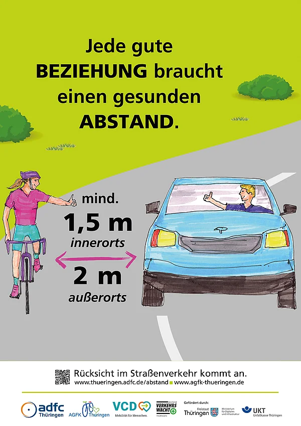 Der Paragraf 5 legt dann ganz klar das Verhalten beim Überholen fest: Wenn man mit einem Kraftfahrzeug jemanden überholt, der zu Fuß geht oder Rad fährt, so beträgt der Mindestabstand innerorts 1,5 m und außerorts 2 m. Da diese Regelung erst seit 2020 so explizit in der Straßenverkehrsordnung steht, ist sie vielen Verkehrsteilnehmenden nicht bekannt. Mit den Bannern und Plakaten der Kampagne, die in Kürze in vielen Orten Thüringens zu sehen sein werden, weisen wir letztlich nur darauf hin, sich so im Straßenverkehr zu verhalten, wie es erwartet werden kann.